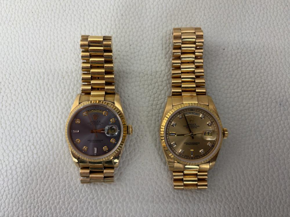 개인 소장 중 롤렉스 데이데이트(Day-Date) 금통 제작형 시계 (금값만 받음) (골드판은 팔렸어요!!!) 롤렉스 데이데이트 타입 (블랙판) • 중량: 18.82돈 (18K 전체 금통) • 특징: 텐포인트 다이아, 세련된 블랙 다이얼 • 가격: 17,120,000원 브랜드 정품 추출이 아닌 별도 맞춤제작형 서울 직거래 💬 문의: 중고나라 채팅 부탁드립니다.
