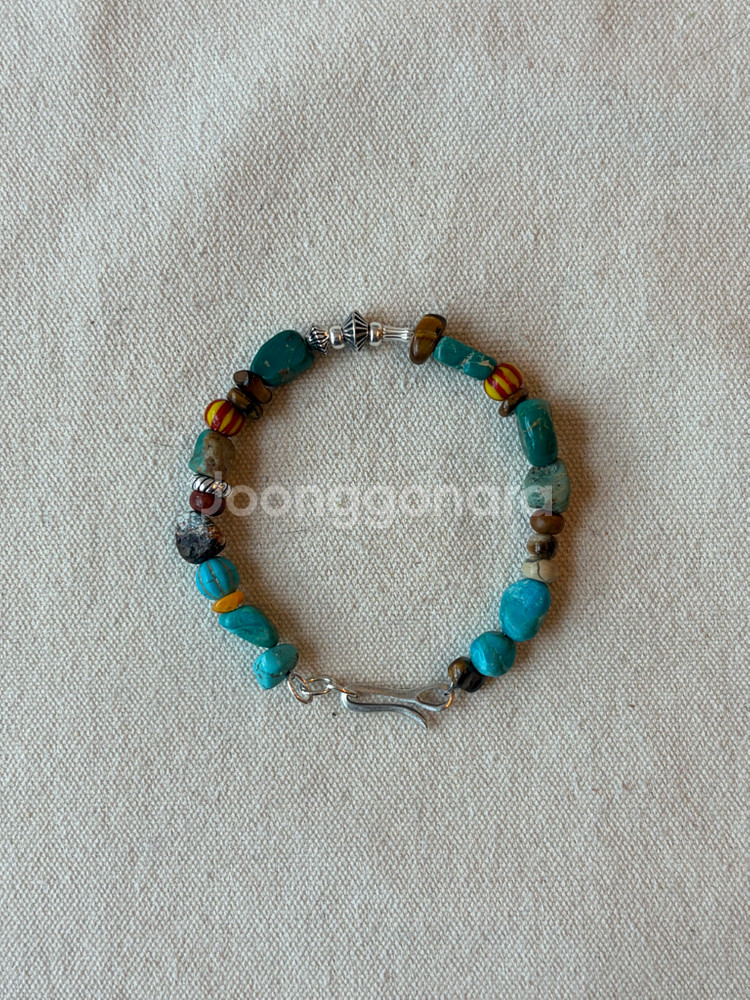 짙은 터키석 컬러를 중심으로 자연석과 빈티지 비즈를 믹스해 사막의 오아시스 같은 분위기를 담은 브레이슬릿입니다. 형태가 일정하지 않은 러프한 스톤을 사용해 인위적이지 않은 자연스러움을 살렸고, 중간중간 배치된 컬러 포인트 비즈가 레트로하면서도 자유로운 감성을 더해줍니다. 은은하게 반짝이는 실버 파츠와 유연한 곡선 훅 디테일이 토곰아비 특유의 빈티지 럭셔리 무드를 완성합니다. 무심하게 티셔츠에 하나만 착용해도 존재감이 있고, 셔츠나 슬랙스와 매치하면 내추럴하면서도 감각적인 스타일링이 가능합니다. ✔ 자연석 특성상 스톤 모양과 컬러감은 미세하게 다를 수 있습니다. ✔ 본인 손목 사이즈에 맞춰 제작해드립니다. (주문 시 손목 둘레를 정확히 기재해주세요.)