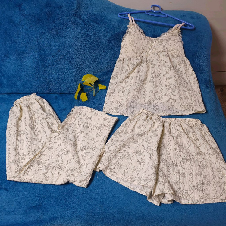 여름용 란제리 세트예요. 베이지 컬러에 꽃무늬 패턴이 예쁘고 여름철 시원하게 입기 좋아요. 상태 양호한 중고 제품입니다.
