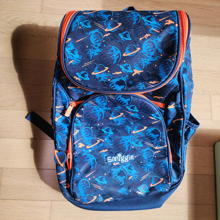 스미글 우주 패턴 백팩이에요. 네이비 바탕에 오렌지 포인트가 들어간 귀여운 디자인으로 학원다닐때 잠깐허서 상태 양호합니다. 아이들이 좋아할 만한 깔끔하고 가벼워서 실용적인 가방이에요.