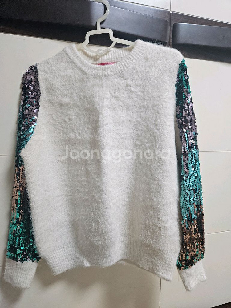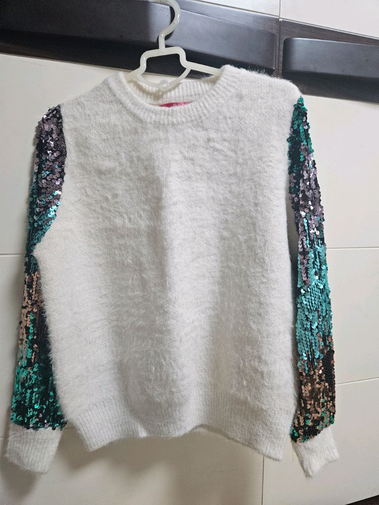 REDJUJU 브랜드의 흰색 스웨터로 양쪽 소매 부분에 스팽글 장식이 되어 예쁘게 코디하여 입기 좋아요. 부드럽고 신축성 좋아요 구입후 입지 않고 보관해 상태 좋아요.