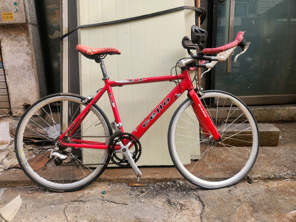 체로 철인3종싸이틀 9단티아그라 장착된자전거 구동계 브레이크 정상작동함니다 휠싸이즈 타이어 650(26인지) 26x1.0타이어 끼셔도 됨니다 소모품은 교체해야하고 그외 기능적인부분은 문재없습니다