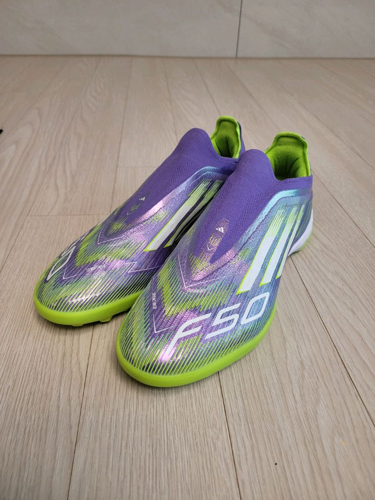 아디다스 F50 엘리트 레이스리스 풋살화 270mm 사이즈입니다! - 독특한 민트색과 보라색의 조합이 돋보입니다 - 레이스리스 디자인으로 편안한 착용감을 제공합니다 - 가벼운 무게로 빠른 스피드를 낼 수 있도록 설계되었습니다 - Crazy11 가방과 신발 주걱도 함께 드립니다 실착 4회정도이고 사이즈 미스로 판매합니다 접지력 매우 우수, 슈팅/킥에 장점이 있는 모델이고 사용감 거의없고 상태 매우 좋습니다