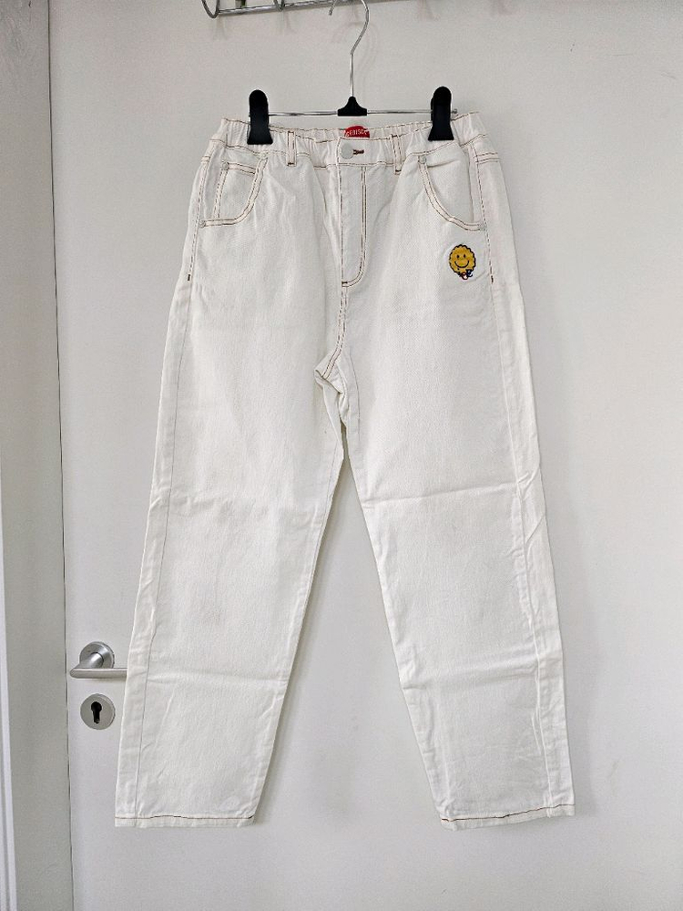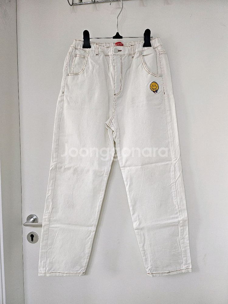 아이스비스킷의 귀여운 스마일 패치 바지입니다 - 면 100% 소재로 편안하게 입을 수 있어요 - 165 사이즈입니다 허리단면 33~34cm 총길이 95cm 입니다. - 흰색 바지라서 어떤 옷에도 잘 어울립니다 - 귀여운 스마일 패치가 포인트입니다 약간의 얼룩이 있지만, 전체적으로 상태는 괜찮습니다