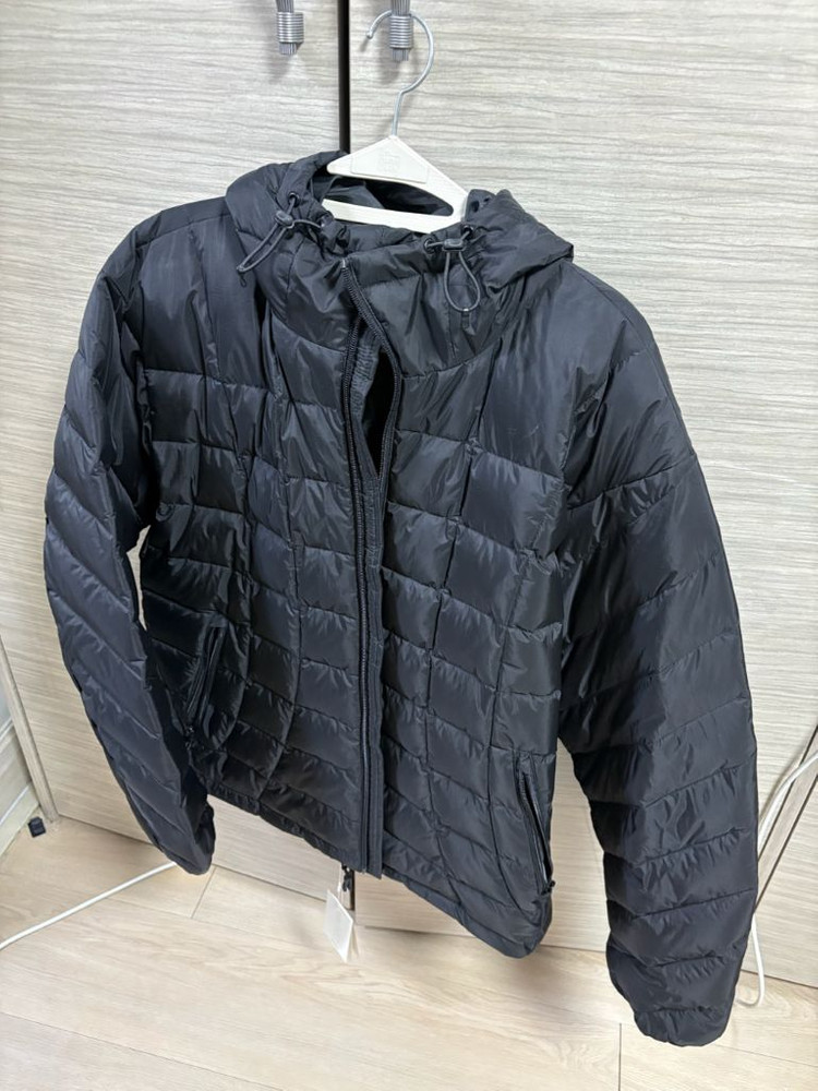 블랙 컬러 경량 패딩점퍼예요. 사이즈는 2이고 후드가 달린 실용적인 경량패딩입니다. 한번도 안입은 택달린 새상품입니다.