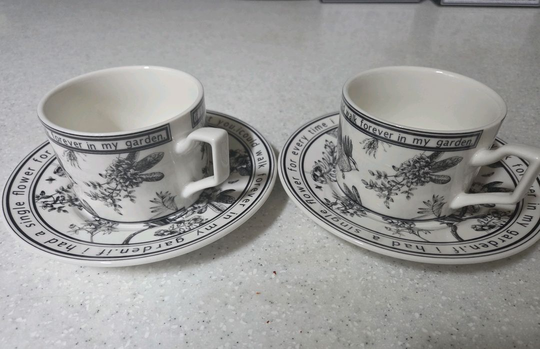 커피잔 2인조입니다. 꽃과 새 패턴이 이쁘며 빈티지 플라워 패턴이 돋보이는 컵입니다. 특별한 티타임을 즐기고 싶다면 추천드리며 집에서 커피나 차 마실 때 사용하기 좋아요 사용감 거의 없으며 보관만했습니다.