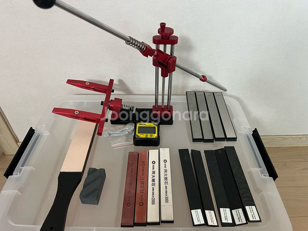 샤프너, 칼갈이로 쓰는 나이프 샤프닝 시스템 미사용 새거입니다. 나이프를 완벽하게 일정한 각도로 샤프닝할수있는 샤프닝 시스템입니다. 탄소강도 가능한 다이아몬드숯돌, 일반숯돌, 폴리싱용 숯돌, 종류별로 다 있구요 전자각도계랑 숯돌평탄화하는거랑 잔여물 쓸어내는 가죽도구? 도 있어요. 모두 미사용 새거입니다.