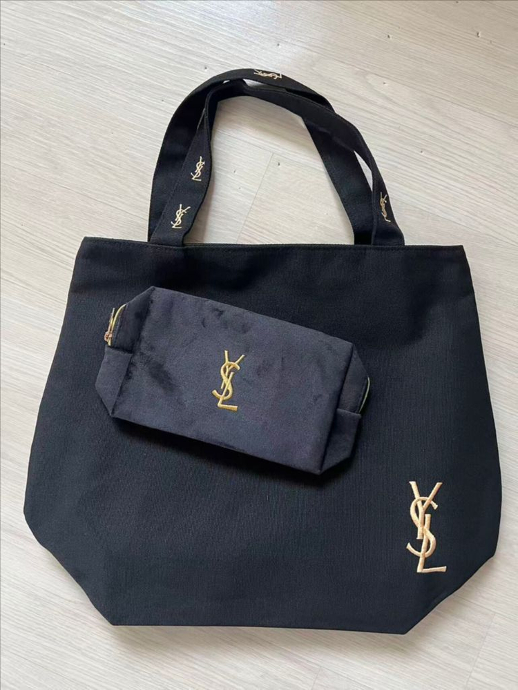 블랙 에코백과 파우치 세트예요. 골드 로고가 포인트이고 실용적인 사이즈라 데일리용으로 딱 좋아요. 새상품입니다