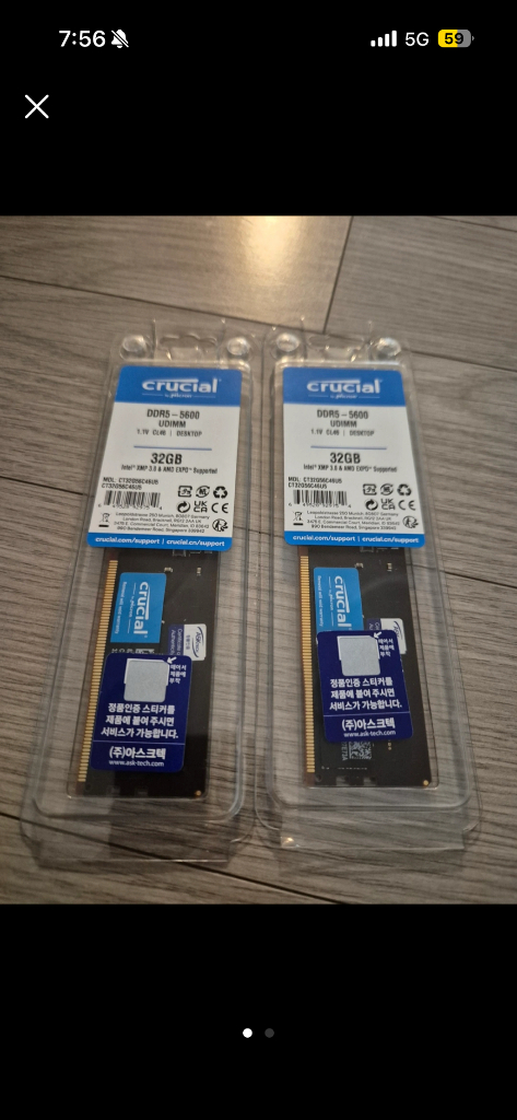 2개 합계 가격입니다 마이크론 Crucial DDR5 32GB 5600MHz 램 2개 64GB입니다 25년 제조품 입니다 PC5-44800, 1.1V, CL46 스펙을 가지고 있습니다 - 고성능으로 게임, 편집 작업에 좋습니다 - Crucial 램은 안정성이 뛰어나기로 유명합니다 - 빠른 속도로 작업 효율을 높여줍니다 -아스크텍 정품이며 라이프타임 as로 문제시 아스크텍에서 새제품 교환해줍니다 택배 직거래 모두 가능합니다