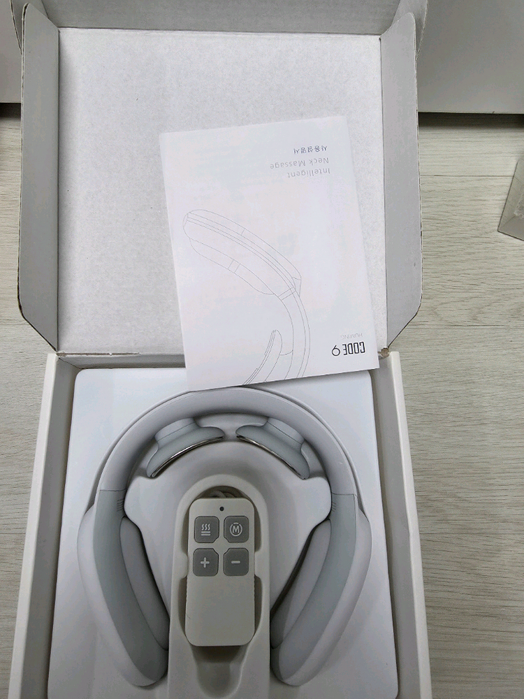 목 마사지기 새 제품이에요. 박스와 구성품이 모두 깔끔하게 보관되어 있고, 설명서도 포함되어 있습니다. 목과 어깨 마사지에 좋은 제품으로 상태 양호해요!