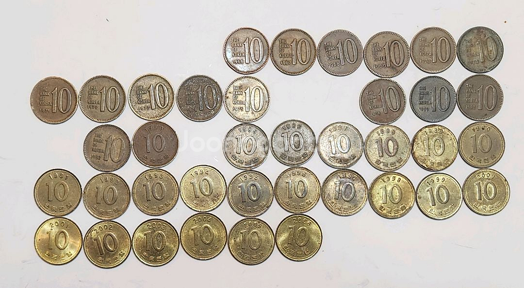 옛날동전, 구형 십원 줄세우기 옛날돈 66,67,68,69,70적동,황동, 73,74,75,(특히 83) ,85,98,2006년 쉽게 보기 어렵습니다 초년도 1966년부터 2006년 까지 모음입니다 (77,81년 제외 / 미발행 ) 수집용으로 좋을 것 같아요 1966년부터 2006년까지의 한국 10원 동전입니다. 오래된 연도의 동전일수록 사용감이 있는 점 참고 부탁드립니다.