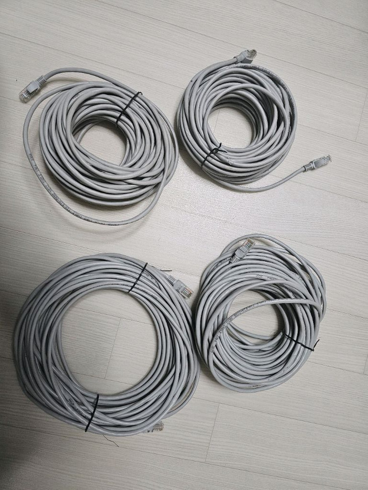 cat.5e 랜 케이블 4개 묶음 개당 6천원 입니다. 기성품 창고에 보관만 했으며 통신테스트 이상 없습니다. 4묶음 일괄 2만원