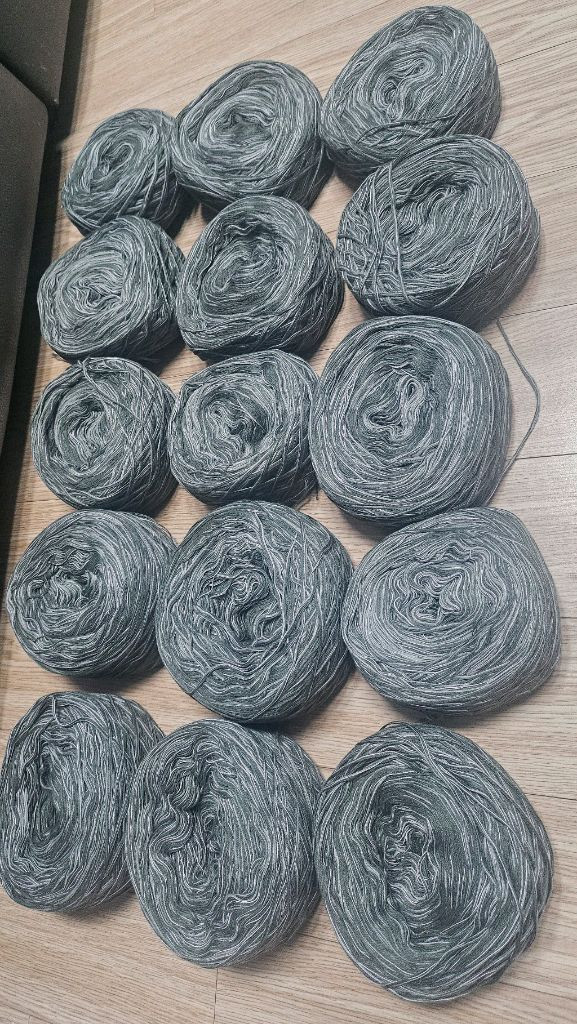실은 깔끔한 그레이와 카키색혹합이에요.뜨개질 취미 시작하기에 딱 좋을 것 같아요! 총 1660그람으로 옷 네벌넘게가능합니다(긴팔기준) 싸게득템하세요
