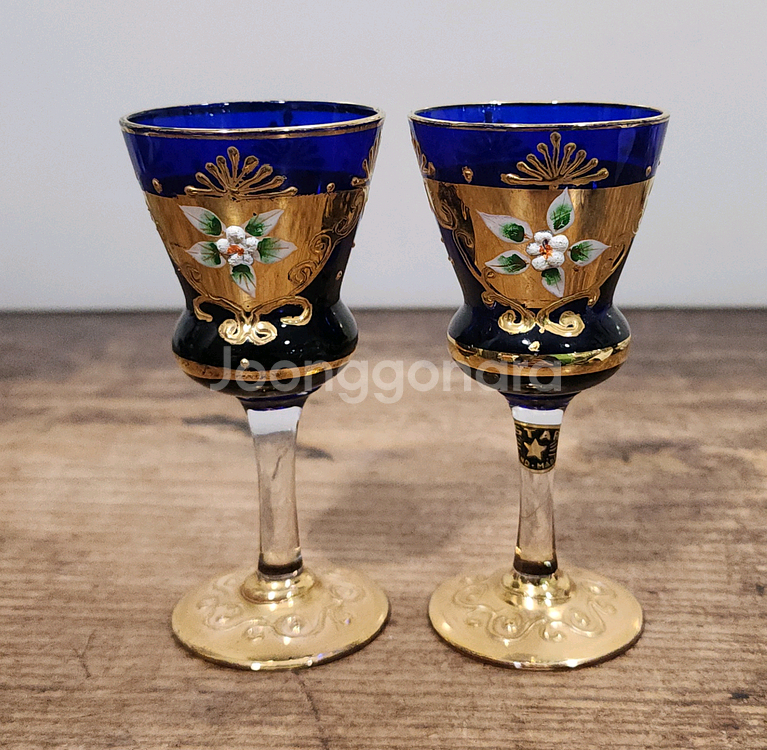 핸드메이드 예쁜 글래스 잔 2피스. 이태리 무라노계열 잔이에요 앤틱이라 금장 살짝씩 약한 부분있을수 있으나 전체적으로 무난해요 가로 5 높이 11 일괄 25000원