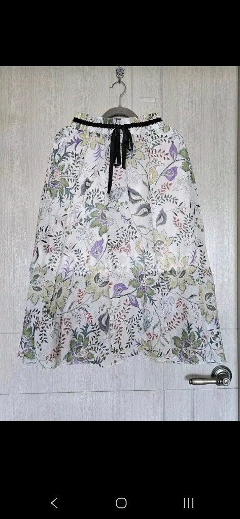더이스트샵 리본 밴딩 롱 스커트 구매 후 드라이해서 보관만 한 새 옷입니다. 면 70%, 폴리 30% 소재예요 밴딩에 리본 디테일 하늘하늘 가볍고 라일락이 핀듯한 내추럴한 플로럴 스커트입니다. 길이 80 환불반품 안돼요