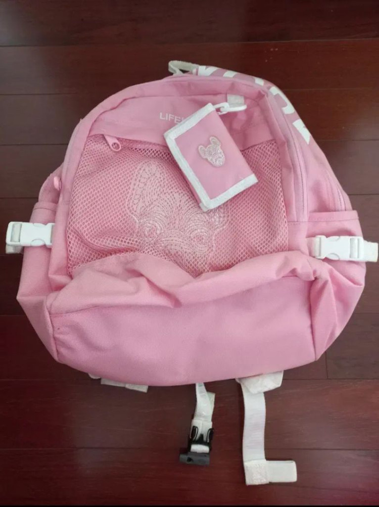 사랑스러운 핑크색 라이프워크 책가방입니다. 앞쪽에 귀여운 라독 그림이 그려진 카드지갑이 달려있습니다. 아이들이 편하게 사용할 수 있도록 가볍게 제작되었습니다. 잘 메지 않아 컨디션 좋아요. 문의 없으시면 바로 안전결제해주시면 됩니다!