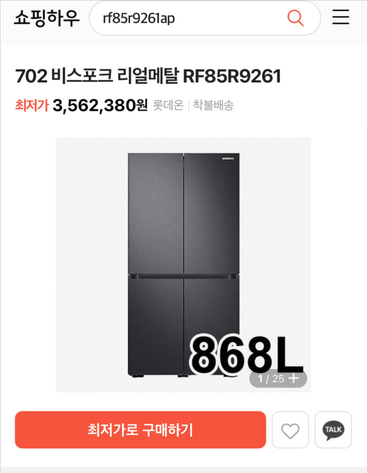 삼성 비스포크 4도어 1등급 냉장고 RF85T9261T1 모델입니다 가전제품은 복불복 이라는 말도 있는데, 운 좋게 아주 좋은 냉장고가 오게 됐어요. 과일 사과의 경우 두 달이 지나도 크리스피하고 아삭함이 그대로 살아있고, 냉동실 고기들의 퀄리티가 그대로 유지됩니다. 김치 냉장고처럼 온도가 진짜 일정합니다. - 총 868L 용량의 넉넉한 수납 공간을 제공합니다. 제조국: 대한민국 2021년12월 신혼 냉장고로 구매하였습니다. 이사가는 곳이 빌트인 냉장고라서 당근하고자 합니다. 패널 색은 다른 색으로 교체 가능합니다. 위 두칸은 냉장고, 아래 두 칸 중 한 칸은 김치냉장고로 이용 가능하여 삼성냉장고를 구매하였습니다. - 트리플 독립냉각 기능으로 냉장실, 냉동실, 맞춤보관실 각각의 냉각기가 있어 냄새 섞임 걱정 없이 최적의 온도와 습도로 식재료를 보관할 수 있습니다 - 맞춤보관 기능으로 냉동, 살얼음, 김치보관 등 6단계 온도 조절이 가능하여 활용도가 높습니다 - 에너지 소비효율 1등급으로 전기료 부담을 줄여줍니다 - 디지털 인버터 컴프레서로 10년 무상 보증됩니다. 3월 31일 1층으로 내려 드릴 수 있고, 3월30일 삼성이전서비스 이용하시면 도와드리겠습니다. 양문형냉장고/4도어/총용량: 868L/냉장: 520L/냉동: 174L/변온: 174L/1등급/홈바: 푸드쇼케이스/ [신선/보관] 메탈쿨링도어/메탈쿨링커버/미세자동정온/아이스메이커: 분리, 슬림/큐브(각얼음)/위생: 탈취(교체형)/ [디자인] 재질: 바이브(메탈)/색상: 브라우니실버/크기(가로x세로x깊이): 908x1853x930mm