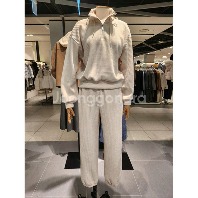 codes combine 브랜드의 코듀로이 트레이닝 반집업 조거팬츠 세트입니다 아이보리 색상으로 부드러운 터치감과 편안한 착용감을 줍니다 상의는 반집업 스타일로 되어있습니다 하의는 조거팬츠 스타일로 되어있습니다 몇번 착용안해서 깨끗하고 상태 좋습니다 M사이즈 (66-77) 입니다 세트 10만원대 구매했어요