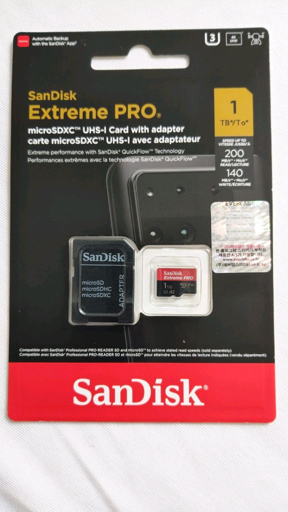 샌디스크 익트림 프로 고성능 마이크로SD카드 1테라 용량으로 어댑터도 함께 포함되어 있어요. 고성능 메모리카드로 빠른 데이터 전송이 가능합니다. 새상품 9482 8532