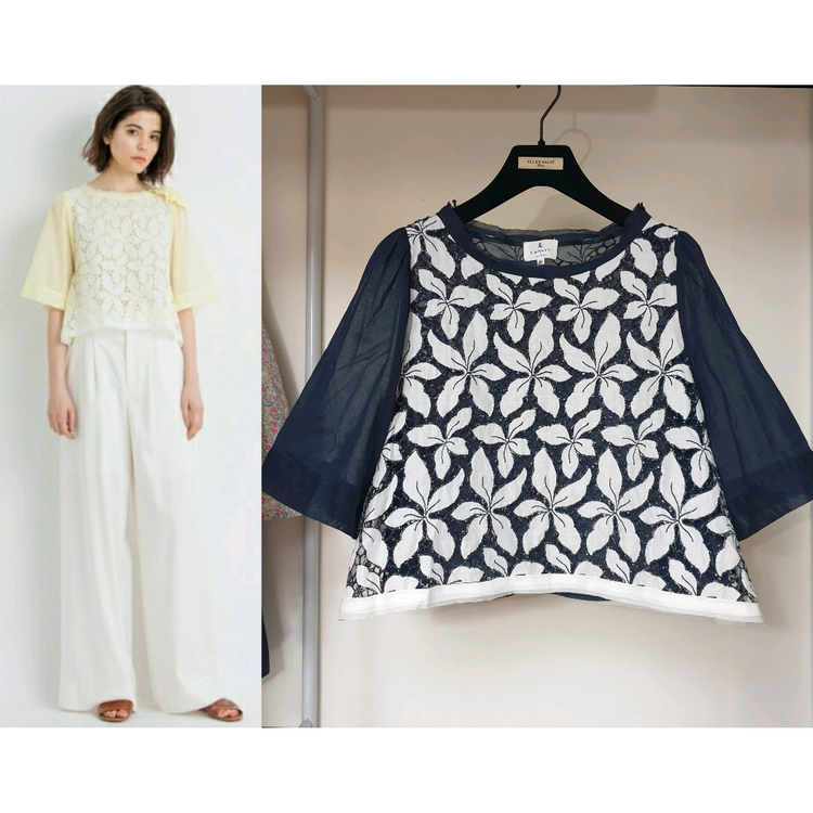 일본판 랑방의 여성스럽고 섬세한 화이트 플라워 아일렛 디테일 크롭 블라우스입니다. 움직임이 편안한 A라인으로 퍼지는 5부 와이드 소매에 아주 얇고 가벼운 아사면 소재라 안 입은 듯 가볍고 쾌적한 착용감을 드립니다. 또한 네이비색 이너탑이 붙어있어 비침 걱정 없이 간편하게 착용할 수 있어요. 미착용품이고 38(S)사이즈로 55 권장드립니다.