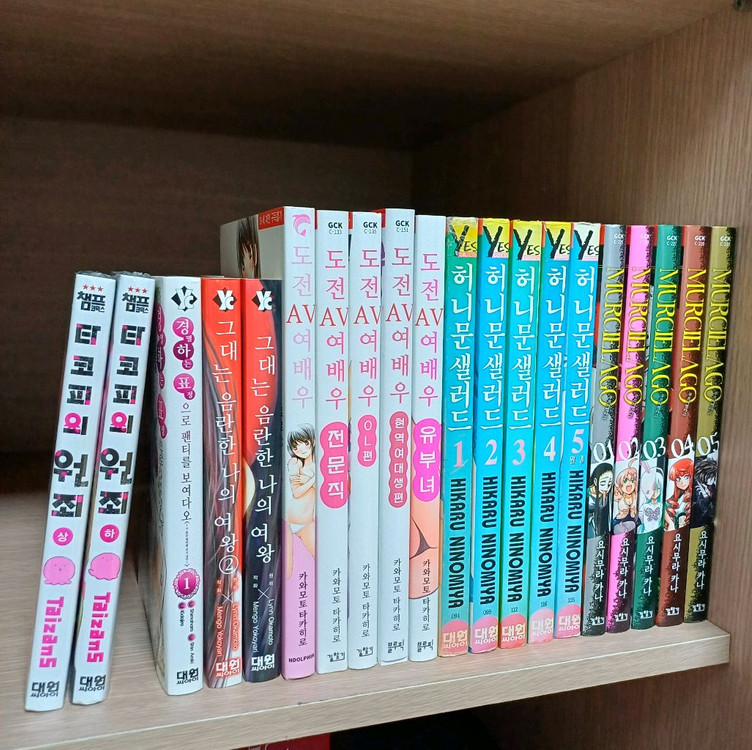 만화책 일괄 택포로 판매합니다. 개별 판매 요청 받지 않습니다. 1. 허니문 샐러드(1-5권 완결) 2. 무르시엘라고(1-5권) 3. 도전 에이븨 여배우(1-5권 완결) 4. 그대는 음란한 나의 여왕(1-2권 완결) 5. 경멸하는 표정으로 팬티를 보여다오(1권) 6. 타코피의 원죄(1-2권 완결) 1은 2000년대 초에 나온 초판이라 세월감이 있습니다만 찢어짐이나 오염은 없어요. 6은 미개봉 책입니다. 나머지는 상태 거의 새 것입니다.