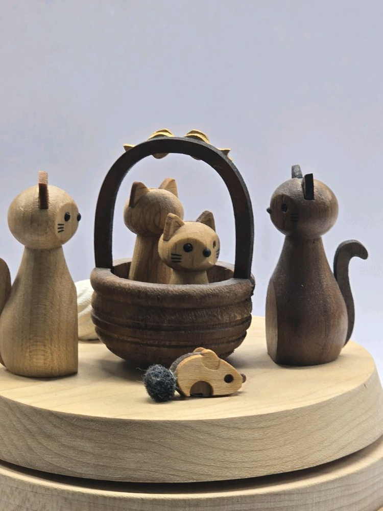 Wooderful Life 브랜드의 Greeting Kitty Wooden Musical Box 우드 감성이 예쁜 오르골입니다 🌿 인테리어 소품으로도 너무 예쁘고 선물용으로도 좋아요. 정리하면서 판매합니다. 상태 양호. 디자인: 아빠 고양이, 엄마 고양이, 그리고 바구니 안에 담긴 아기 고양이 세 마리로 구성된 화목한 고양이 가족을 묘사하고 있습니다. 소재: 따뜻하고 포근한 느낌을 주는 천연 원목을 사용하여 수작업으로 제작되었습니다. 작동 방식: 태엽을 감으면 상단판이 회전하며 멜로디가 연주되는 회전형 오르골입니다.