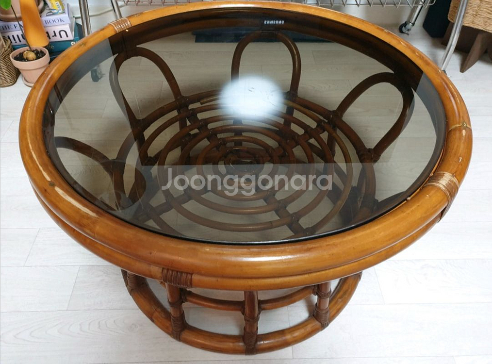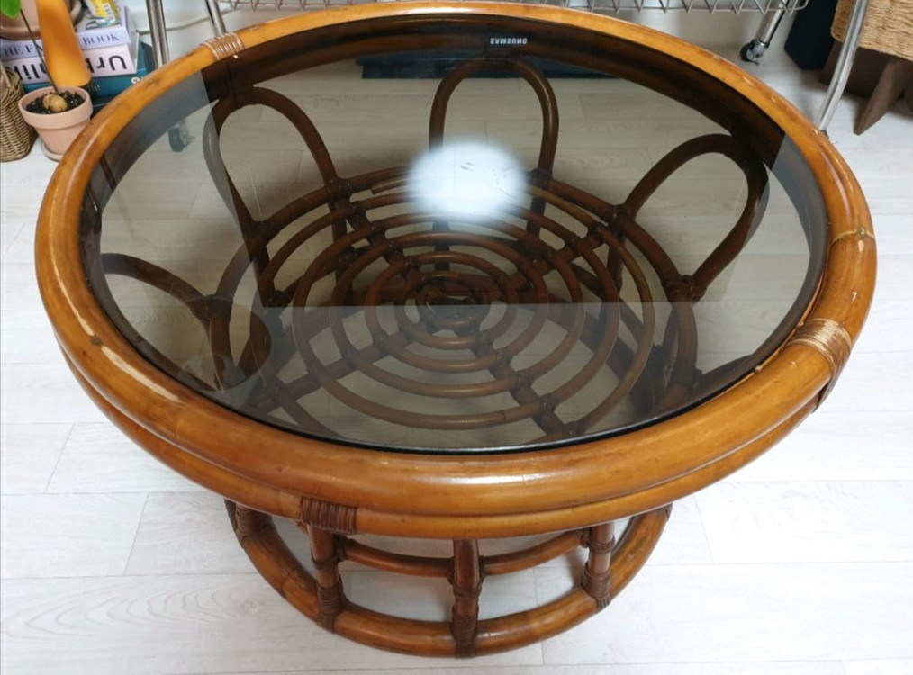 등나무 소재의 원형 유리 테이블입니다 브론즈 색상의 유리가 레트로하고 빈티지한 느낌을 더합니다 희소성이 강하고 어디에도 없는 디자인으로 수집가치가 높습니다 기존유리 스크레치가 너무 많고 얇아서 폐기후 주문제작한 새제품 강화유리입니다 유리 사이즈만 폭 60cm입니다 사이즈 참고하세요 취미로 가구제작도 하는데요 본덱스 무광 바니쉬 코팅 2회 이상 발랐습니다 색감이 더 살아나네요 시흥시 은계북길 7 으로 오시면 됩니다