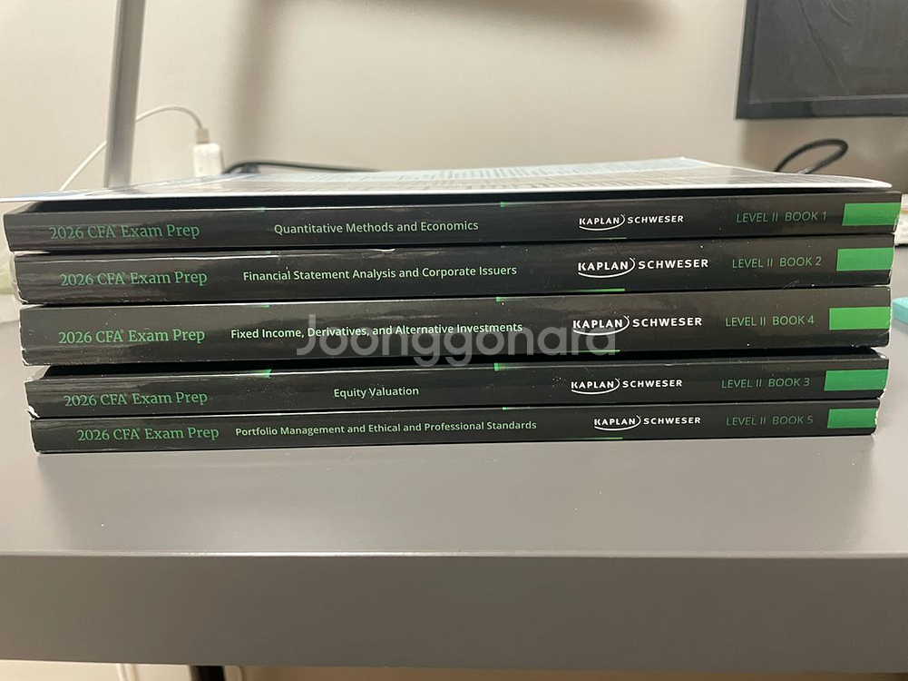 2026년 CFA 시험 대비 Level II Kaplan Schweser 교재 세트입니다 - Quantitative Methods and Economics - Financial Statement Analysis and Corporate Issuers - Fixed Income, Derivatives, and Alternative Investments - Equity Valuation - Portfolio Management and Ethical and Professional Standards 2025 CFA essence study guide book 도 함께 드립니다 공부하다가 인강 취소해서 판매합니다. fsa los 2개, 채권, 파생 los 1/3개 만 하이라이팅 및 필기했습니다. book 1,3,5는 아예 피지도 않았습니다. 편하게 연락주세요.