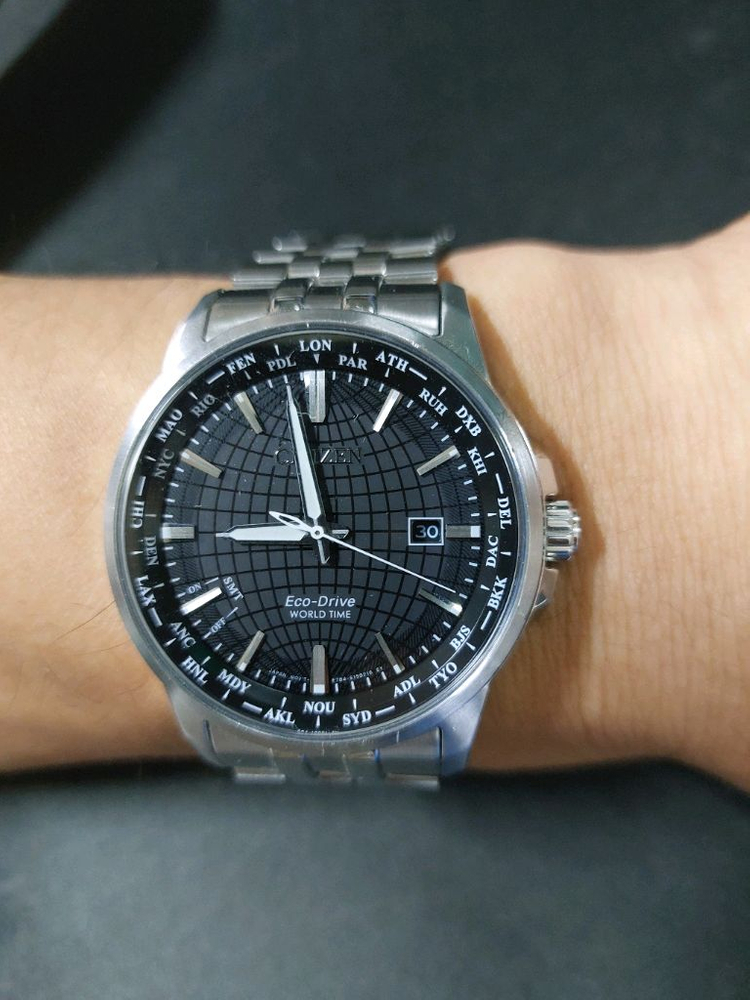 시티즌 에코드라이브 월드타임 모델 테두리 밴드 생활기스있고 자연스러운 사용감있지만 상태 좋습니다. 사파이어글라스 솔라 무브먼트 에코드라이브 광충전방식 날짜창. 퍼페추얼캘린더 기능. 현재줄길이 대략17.5cm 여분줄 2칸. 설명서. 여분줄.박스