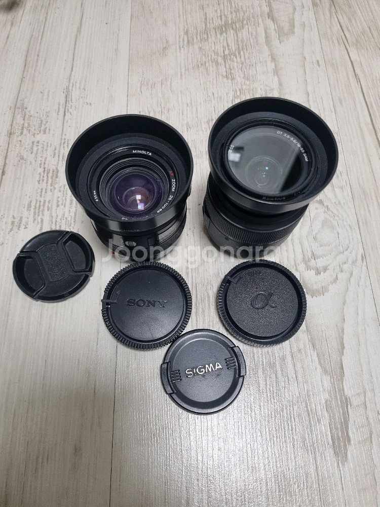 미놀타와소니의 DSLR 렌즈들을 일괄 판매해요. 렌즈캡과 후면캡도 함께 포함되어 있고, 전체적으로 사용감은 있지만 광학 상태는 양호합니다. 1. 미놀타AF35-100mm F3.5-4.5 줌렌즈(알파마운트) 2. 소니표준 줌렌즈 DT18-55mm F3.5-5.6 (알파마운트) 일괄 렌즈 2개 판매합니다. 소니줌렌즈는 UV필터 있음. 렌즈 모두 후드 있음 . 앞은 모두 호환캡 뒤캡은 정품캡 입니다. 성능및 기능 이상없고 작동 잘 됩니다. 채팅주세요.