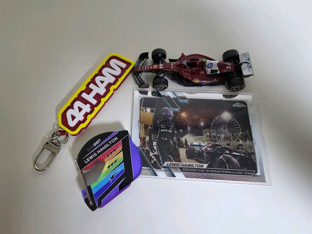 F1 루이스 해밀턴 다이캐스트와 카라비너, 키링, 카드 세트입니다. 부라고에서 제작한 페라리 SF-25 모델이며 1:64 스케일 입니다. 카라비너는 헬멧 모양이며, 키링과 같이 가방 등에 걸 수 있습니다.