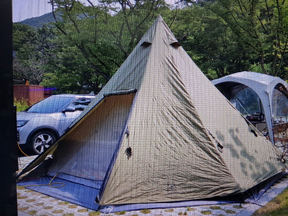 캠핑용 에어텐트입니다. 설치가 간편하고 넓은 공간을 제공해 캠핑하기 좋아요. 사용감은 있지만 기능상 문제없이 잘 사용할 수 있습니다.