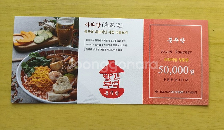 * 중고나라에서 사슴무 로 검색해 보시면 많은 판매내역 있고, 현재도 다양한 물품을 판매중입니다. 안심하고 구매해주세요. * 무료 택배배송하며 배송후엔 환불은 안됩니다. * 문자 주시면 채팅보다 답변이 더 빠릅니다. o l o 2 8 1 2. 7 4 2 1. ● 홍주방 상품권 5만원권 --> 42,000원 1개 있습니다. 무료 택배배송 합니다. 기간은 26년 6월 1일까지. 실물사진 참고하세요. 빨간 부엌 홍주방 홍주방 대표 메뉴 : 마라탕 마라샹궈 꿔바로우 마라떡볶이 마라로제상궈 통통새우꿔바로우 ※ 사용가능 매장 : 홍주방 남포점, 홍주방 하단점 ※ 유의사항 - 잔액은 돌려받지 않습니다. - 세금계산서, 현금영수증은 발행되지 않습니다.