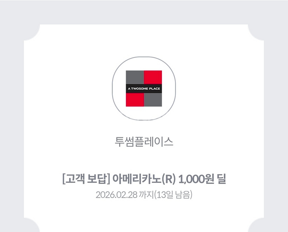 투썸 아메리카노 1000원에 구매 가능 비용추가시 다른 음료 변경 가능 (3700원 할인) 푸드, 병음료, MD상품 적용 불가 바코드로 보내드립니다. 이용방법 읽어보시고 아시는 분들만 연락주세요 이용기한 : ~ 2026년 2월 28일