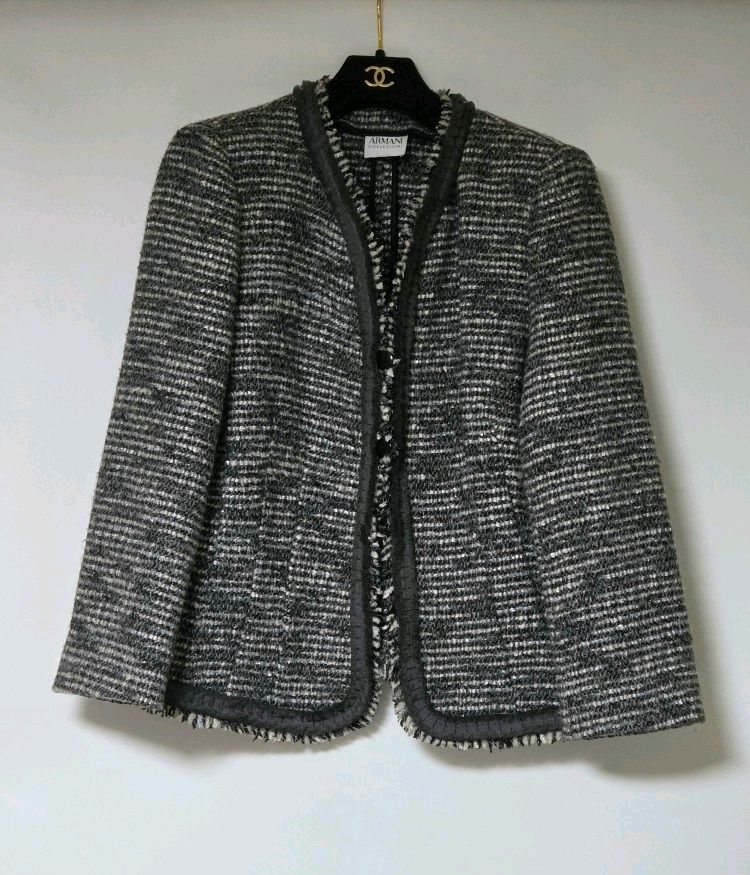 우아하고 고급스러운 아르마니 꼴레지오니 ARMANI COLLEZIONI 트위드 자켓 국내 매장 구입으로 정가 150만원 이상 소재 모 64, 폴리에스터 18, 나일론 14, 레이온 2, 폴리우레탄 2% 택 기재 이탈리아 44사이즈, 91-96-165인데 실측 어깨 38, 가슴 반품 46, 기장 56cm로 작게 나옴 앞섶과 하단 라이닝 포인트 어깨 패드 있어 라인 잡아 주며 뗄 수 있음