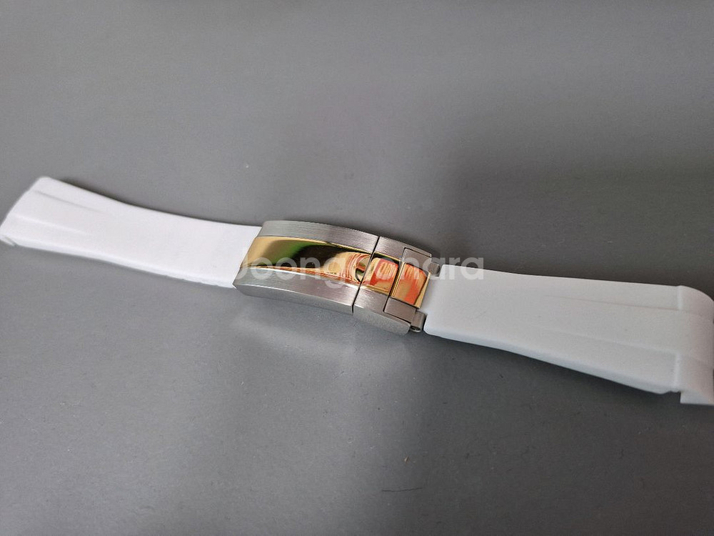 시계 화이트 러버밴드 스트랩 조절식 더블락 골드 콤비 버클 고급스러운 디자인의 시계 러버 밴드 스트랩입니다. 콤비 버클과 화이트 러버의 조화가 돋보입니다. 러그20mm용이며 스포츠와치 범용입니다 땀에도 강해서 관리가 용이합니다.