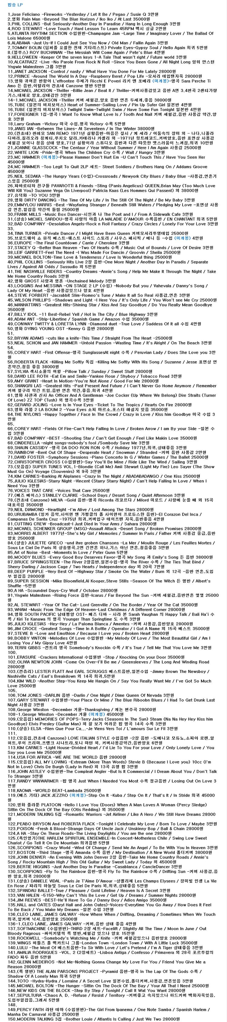 카페 글쓰기가 안되서 리스트를 다 올릴수가 없네요. 앱은 5000자 이내라서.. 가요,팝,클래식 소장 2600장중 팝송입니다. 사진으로 목록을 올렸는데 늘려서 보시고 고르시면 됩니다. 컴퓨터에서 보시면 좀 더 잘 보실수 있고 카페에서 보시면 더 편리합니다. 다만 카페글 수정조차 안되게 해놔서 재고와 가격이 음반의 상태에 따라서 조금씩 다를수 있습니다. (7번 문의사진) 보시고 문의주시고 구입하시면 편리합니다. 중고나라 카페 주소입니다. 가요,팝 / 클래식 https://cafe.naver.com/joonggonara/1039119180 https://cafe.naver.com/joonggonara/1039119376 안전결제하시려면 고르신 후 합산을 계산하시면 되겠습니다. (합산한 상품을 하나 등록해 드리거나 원하시는 방법을 해 드리겟습니다.) * 판매된건 게시글을 지웁니다. 게시 날짜가 오래되도 안지워진건 재고 있습니다. * 배송은 음반 보호비닐 서비스 + 뽁뽁이비닐 + 음반 전용 박스 포장 보내드려요.