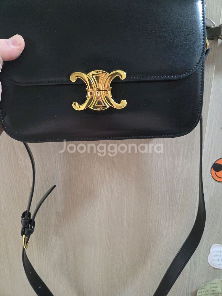 여성 트리옹프 크로스백이에요. 블랙 레더에 골드 하드웨어가 고급스럽고, 내부도 깔끔한 상태입니다. 클래식한 디자인으로 오래 사용하기 좋아요. 정말 심플 하면서 되게 이쁜 가방 입니다!!! 상태는 엄청 깨끗하며 절다 후회 없으실거에요 구매시 미니어쳐 향수랑 같이 서비스 드려요~~~