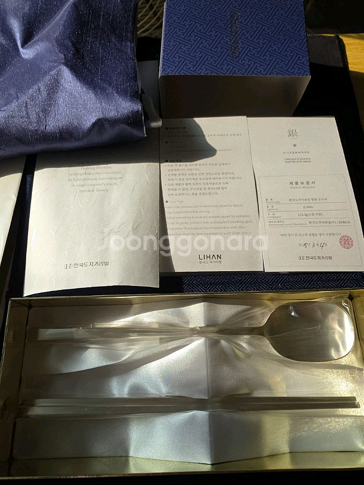 한국도자기 리한 노아 예단 은수저 1인 세트입니다. 은99% 30돈 112.5g 사진에보이는 구성품 전체 포함 입니다. 직거래도 가능하며 택배거래시 노리턴으로 가능합니다.