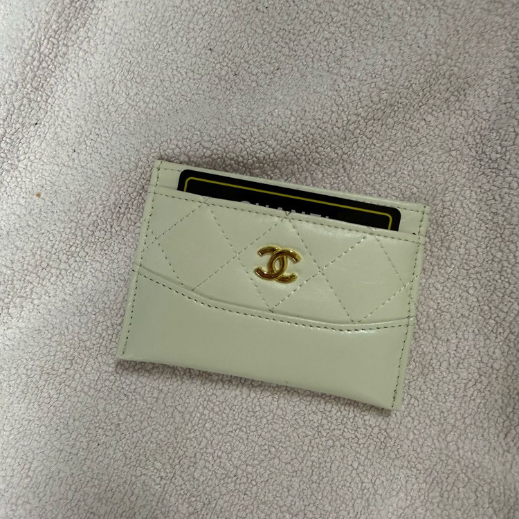 시그니처 퀼팅 디자인의 크림색 카드지갑이에요. 골드 CC 로고가 포인트로 들어가 있고, 카드 수납공간도 넉넉해서 실용적입니다. 새상품입니다