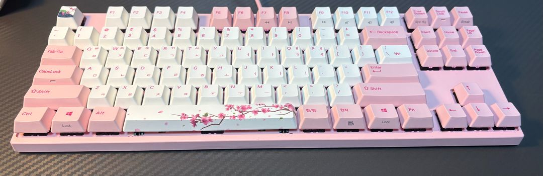 핑크와 화이트 투톤 컬러의 기계식 키보드예요. 핑크색 바탕에 화이트 키캡으로 예쁜 디자인이 특징이고, 상태도 깨끗해 보입니다.