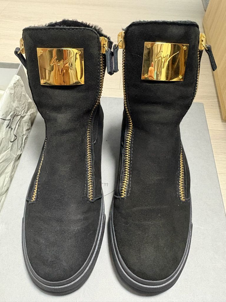 쥬세페자노티 스웨이드 부츠 하이탑 스니커즈 일본 백회점 구매 정품 미착 신품이고 박스,파우치,택 등 풀구성 사이즈 표기41에 253~4 정도 사이즈감 (255 발볼러 X) 천연 양털 스웨이드로 제작된 브랜드 감성 잘 살린 디자인으로 무난하면서도 포인트가 확실한 끝판왕급 럭셔리 포인트 아이템. 구매가 약 200만.