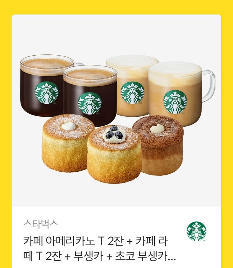 카페 아메리카노 T 2잔과 카페 라떼 T 2잔, 부생크림, 초코 부생크림으로 구성된 세트입니다. 깔끔한 상태의 음료와 디저트 세트예요. 원가 3만 5천 700원입니다. 유효기간 27년 2월 25일 까지입니다.