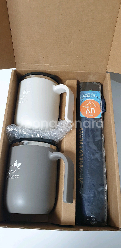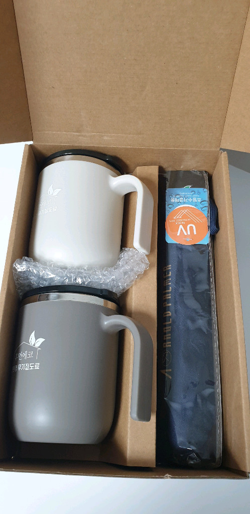 무기질 도료 머그컵 2개와 아놀드파마 우산 세트입니다 ~ - 우산은 폴리에스터 100% 재질로 만들어졌습니다. - UV 코팅 처리되어 자외선으로부터 안전하게 보호해줍니다 - 방풍 기능이 있어 강한 바람에도 끄떡없습니다 - 선물용으로 좋아요