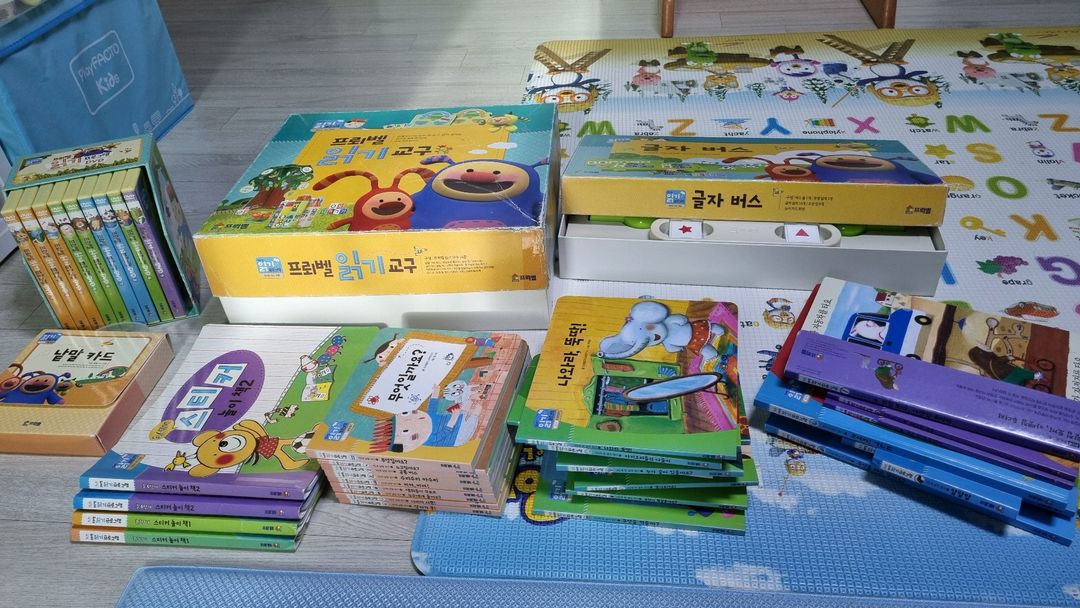 프뢰벨 읽기프로그램 풀세트입니다 도서 29권, 교구, 글자버스, dvd, 낱말카드, 스티커북 포함입니다. dvd는 다 있지만 음원cd 1장 누락이며 교구 일부 누락이 있을 수 있지만 거의 다 있어 보입니다. 스티커북은 1,2권 2권씩 있지만 거의 다 사용을 했습니다. 전체적으로 사용감있습니다. 아주 큰 우체국 택배 상자로 택배 해야될거 같은데 5천원 부담하시면 이상 금액은 제가 부담하겠습니다. 직거래 가능합니다.