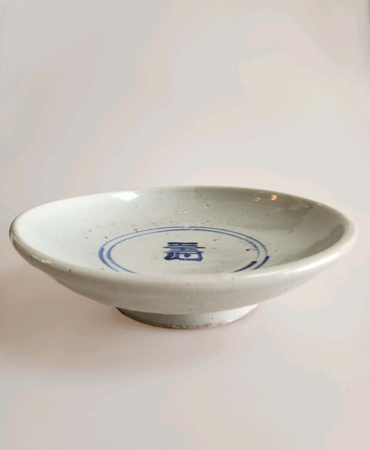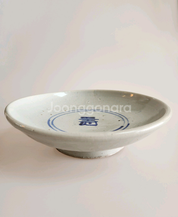 조선 말기 분원 관요에서 제작된 청화백자 수자문 대형접시입니다. 내저부에는 장수를 기원하는 壽 (수)와 이중 선문이 청화로 시문되었습니다. 잘 정제된 태토를 사용해 수비가 잘되었고, 청화 발색은 번짐 없이 안정적으로 자화되었습니다 제원: 구연부 21.3cm, 높이 5.8cm 20cm를 상회하는 대형접시임에도 불구하고 비례가 안정적이며 전체적인 형태 균형이 뛰어납니다 이와같은 상태 온전한 대형 접시는 현존 예가 많지 않아 희소성이 있습니다 상태는 튐 유 수리가 없이 완벽합니다