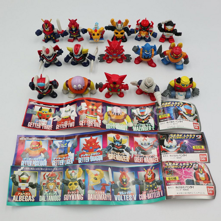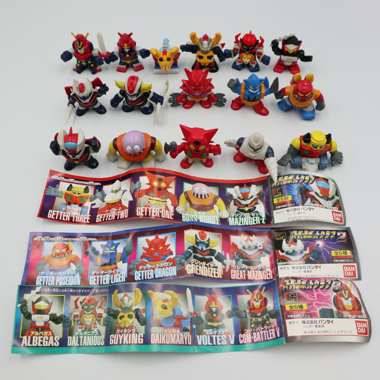 슈퍼로봇대전 슈퍼로봇클럽 가샤폰 피규어 1,2,3탄 올콜렉트 미개봉 새제품입니다. 30여년전 발매된 제품으로, 1탄 5종, 2탄 5종, 3탄 6종으로 구성된 구수한 느낌의 귀여운 가샤폰입니다. 미개봉 새제품으로, 사진은 본인 소유품으로 직접 촬영한 것입니다. 계좌이체 기준입니다.