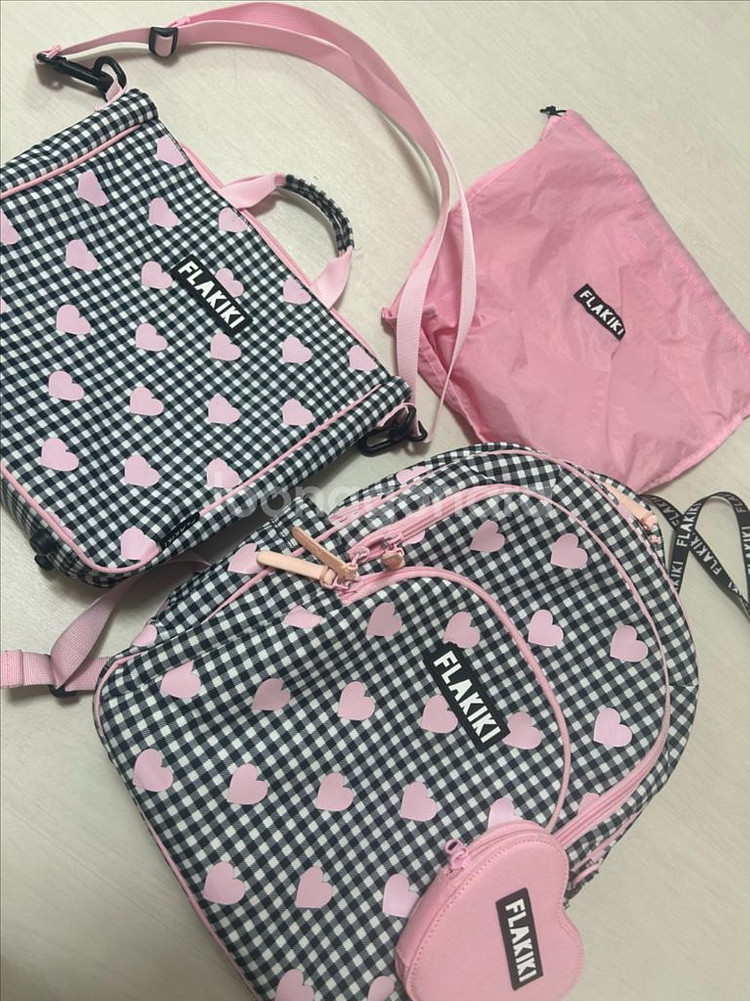 플라키키 2024년 구입했어요 가방 3개로 돌려가며 갖고다녀서 많이 사용은 안했어요 전체적으로 생활 사용감 오염( 가방속 연필자국이나 때묻음 등) 가방 지퍼 여닫는 지퍼까임이나 윗부분 하트 프린트 갈라짐 까짐 있어요(사진참고) 보조가방은 학교에 두고 다녀서 깨끗한 편이에요 학교보내보니 세컨가방 꼭 필요하더라구요!! 택포에요 세컨가방으로 편하게 사용하실분 연락주세요 010 9097 2948