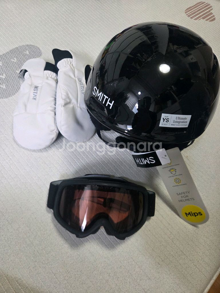 스미스 헬멧, 스미스 고글, INSTAY 장갑 세트입니다 - 헬멧은 검정색입니다 - 고글은 검정색 프레임에 IM2 렌즈입니다 - 장갑은 흰색입니다 헬멧에는 MIPS 안전 기술이 적용되어 있습니다 새상품이고, ys(51-55)사이즈 입니다. 유아 또는 머리작은 초등 저학년 사용하기 좋을거 같습니다