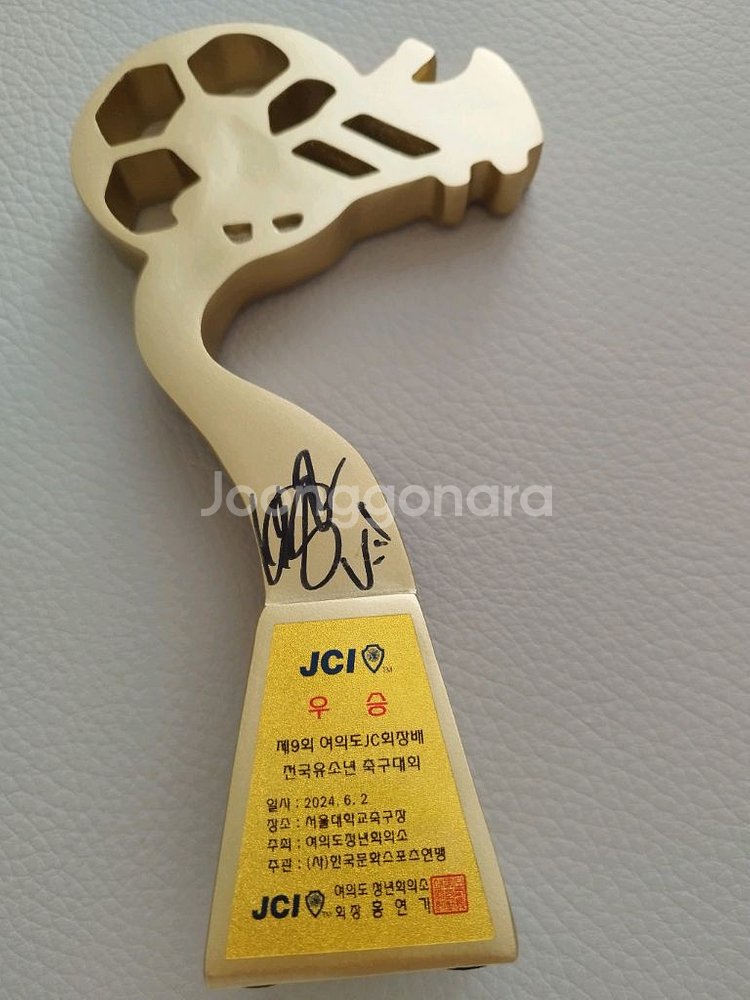 이강인 싸인 축구 우승 트로피입니다. 축구 우승을 기념하는 골드 컬러의 기념상이에요. 인증사진도 있어요
